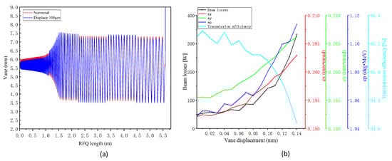 An RFQ has various errors, including alignment errors and installation errors induced by the machine, inter-vane voltage errors, and dipole components caused by the field tuning. The electrode length of the RFQ is 5.7 m, the RFQ needs to be divided into five segments during the machining. It is necessary to study the effect of the alignment error (X and Y-directions) between each segment of the RFQ on the transmission efficiency. Figure 5a shows the comparison of the electrodes’ envelope with no error and with a deviation of 100 µm. Toutatis software [] can be used to simulate the influence of alignment error on beam transmission, and the simulation results are shown in Figure 5b. When the alignment error is 100 µm, the transmission efficiency of RFQ is still greater than 95%.