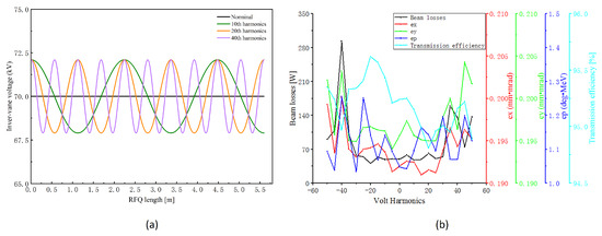 where n is the harmonic number (n is an integer),  is the nominal inter-vane voltage, and V is the amplitude of residual voltage error, which is set to 3% . L_rfq is the RFQ length. Figure 7b shows that the different voltage harmonics have no obvious influence on beam transmission efficiency.