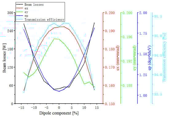 The asymmetry of the four quadrants of the RFQ will result in dipole field components. Figure 8 shows the influence of the dipole components on the beam transmission efficiency, which should be controlled to be less than 9% in order to avoid a significant increase in beam loss.
