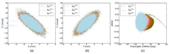 When  approaches 1,  will approach , indicating that the higher the charge state is, the closer the synchronous phase of the nearby charge state particles is, the easier it is to be simultaneously accelerated in an RFQ accelerating cell. Impact-T is used to simulate the simultaneous acceleration of the three high-charge-state ions. Some research has shown that the high-charge-state mixed ions and the single-high-charge-state ion have similar beam parameters [,]. Therefore, we assume that the beams with different charge states have the same input parameters. The output phase distributions are shown in Figure 9; the main parameters are listed in Table 3.