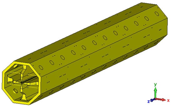 Multi-physics analysis is a coupled electromagnetic, thermal, and mechanical analysis of the structure using CST []. The power-loss distribution of the RFQ cavity is first simulated. Secondly, the temperature map can be achieved by importing the power loss to the steady-state thermal analysis. Thirdly, the structural stresses and deformations of the RFQ cavity are calculated by applying the thermal result. Finally, the resonant frequency shift can be calculated according to the structural deformations. In the multi-physics analysis, the power consumption of the cavity was set to 68 kW, considering a power redundancy of 20% []. The waterways of the RFQ cavity were designed as shown in Figure 16, with three channels on each electrode and two channels on each cavity wall. In addition, each PSL is provided with a water channel with an 8 mm diameter for cooling. In the simulation, the water temperature and ambient temperature are set to 20 C. The heat transfer coefficient h can be obtained by the Dittus–Boelter correlation []: