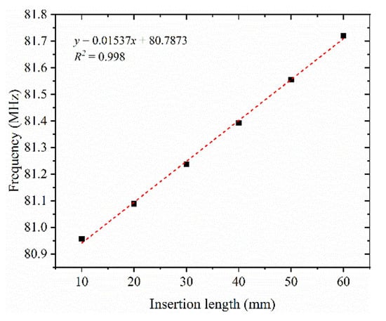 There are 48 tuners with an outer diameter of 100 mm, with 12 tuners per quadrant, as shown in Figure 12. The nominal and maximum penetration depth of each tuner is 30 mm and 60 mm, which can achieve a frequency tuning from 80.705 MHz to 81.724 MHz. Frequency changes with the insertion depth are shown in Figure 13. The frequency sensitivity per tuner is about 0.32 kHz/mm.