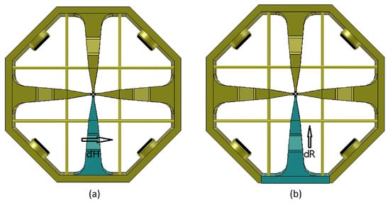 The temperature distribution of the cavity is shown in Figure 17a. The maximum temperature rise in the cavity is 13.6 C and is located at the output undercut of the cavity. The maximum deformation occurs at the same location with a size of 40.3 µm. As shown in Figure 17c, the maximum thermal stress is 14.3 MPa, which is lower than the yield strength of oxygen-free copper (60 to 70 Mpa) []. Finally, the frequency shift caused by the deformation is −22.8 kHz.
