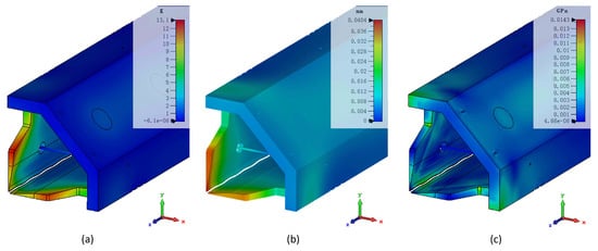 Simulation results of Multi-physics. (a) The temperature distribution of the cavity, (b) The deformation distribution of the cavity, (c) The thermal stress distribution of the cavity.