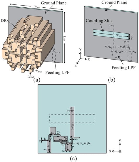 Figure 1. The configuration of the proposed antenna: (a) overall view, (b) substrate view, and (c) back side-cut view of the substrate (the xy plane). DR = dielectric resonator. LPF = low-pass filter.