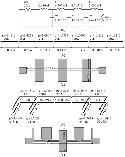 Since a filter was needed that could be integrated into the narrow space of the antenna base; we modified the step-impedance structure via stub equivalence. In the equivalent circuit shown in Figure 2a, the portions corresponding to Z0, L1, C2, C6, L7, and ZL could be converted into stubs using Richards’ transformation and Kuroda’s identities [21]. The step-impedance structure was maintained because the parts corresponding to L3, C4, and L5 did not interfere with the line deformation. The transmission-line model of the modified step-impedance filter was designed accordingly and is shown in Figure 2d; the optimized shape for the microstrip is presented in Figure 2e.