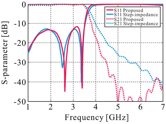 Figure 3. S-parameter of the proposed seventh-order Chebyshev LPF and step-impedance of the same low-pass filter.