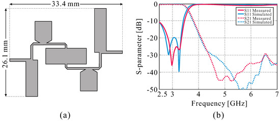 Figure 4. Proposed filter and the S-parameter. (a) A microstrip line model of the proposed filter optimized for the antenna base and (b) the simulated S-parameter.