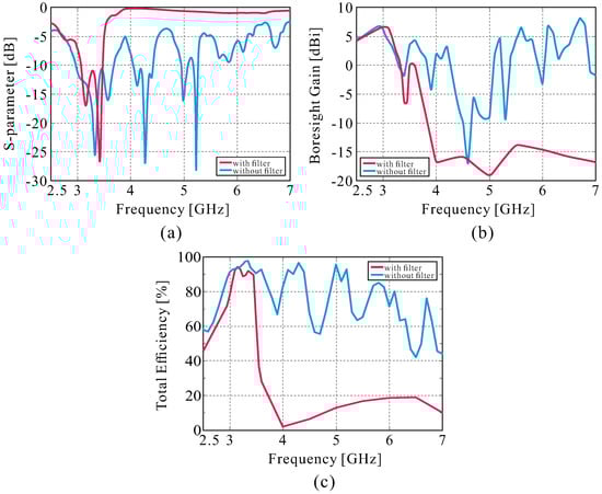 Figure 5. Simulation results of the proposed antenna with and without the filter: (a) the S11, (b) the boresight gain, and (c) total efficiency of the antenna.