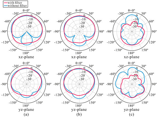 Figure 6. Simulated far-field radiation patterns of the proposed antenna with and without a filter: (a) 3.25, (b) 3.3, and (c) 6.5 GHz.