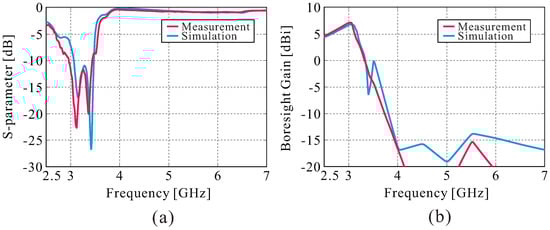 Figure 8. Measurement results of the fabricated antenna and the simulation. (a) The reflection coefficient and (b) the boresight gain.