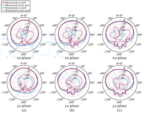 Figure 9. The far-field radiation pattern of the simulated and fabricated antennas: (a) 3.25, (b) 3.3, and (c) 3.35 GHz.