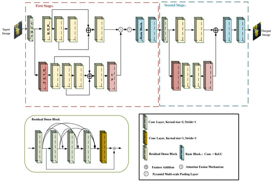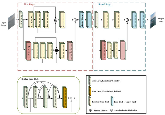 The framework of our previous two-channel and two-stage image dehazing network (DTD-Net) is shown in Figure 1. The main modules of network structure include RDB module, basic module, up-down sampling, and attention mechanism. Specifically, the RDB module is mainly composed of two convolution layers of different sizes to better obtain the hazy image features. In order to reuse features to avoid information loss, the output of each convolution layer of the RDB module is taken as the input of the subsequent convolution layer. Then, a convolution layer of size 3 and ReLU activation function constitute the basic module. Bilinear difference up-sampling is introduced to expand the network channel, and attention mechanism is used to weight the expanded features to improve the effectiveness of the network. The visual effect and quantitative indexes demonstrate that the deraining network designed has strong dehazing performance. For more details, please refer to our paper [29].