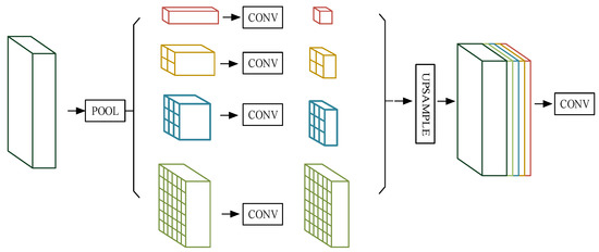 The pyramid multi-scale pooling layer is a verified and effective global context prior module, which uses different scales of the pooling layer and the convolution layer to retain different scales of global information to avoid information loss [31]. The pyramid pooling layer adopted in this paper has four different pyramid scales: 1 × 1, 2 × 2, 3 × 3, and 6 × 6. Firstly, the feature maps are pooled to the target size. Then a 1 × 1 convolution is performed on the pooled result to reduce the number of channels by a quarter. Besides, the bilinear interpolation is used to up-sample each feature graph in the previous step to obtain the same size as the original feature map. Next, the original feature map and the up-sampled feature map are spliced according to the channel dimension. The obtained channel width is twice that of the original feature map. Finally, 1 × 1 convolution is used to reduce the channel to its original size as the output of the multi-scale pooling layer of the pyramid. The global information is improved on the basis of retaining the output characteristics of attention mechanism. The structure of the multi-scale pooling layer of the pyramid is shown in Figure 4.