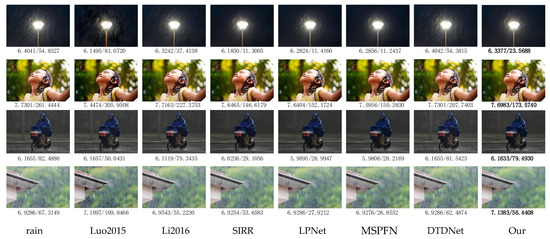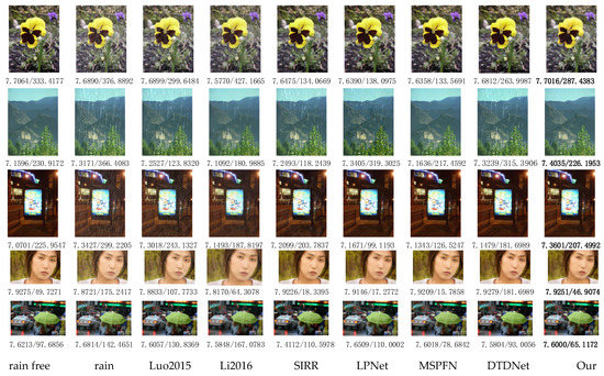 Moreover, qualitative comparisons are shown in Figure 6. The four test images were selected from Rain100H and Rain100L with different rain streaks texture and density, respectively. On the basis of comparing with the original picture, the information entropy and contrast were also calculated for each image. The format of “Entropy/Contrast” is noted below the image. It can be seen from the experimental results that the rain removal network designed in this paper is superior to other comparison methods, especially for the visual effects. In addition, the overall performance of the rain removal method based on a convolutional neural network is better than the traditional image rain removal method. Specifically, the two traditional rain removal methods could only remove a small part of the rain streaks, and there were obvious removal artifacts. Besides, the removed region of the rain streaks could not be merged with the image background. Compared with the traditional methods, more rain streaks could be removed and the image background could be better restored by SIRR and LPNet. However, there were still more visible rain streaks that had not been removed and the resolution of the output image was limited. MSPFN had a considerably better rain removal effect, but it can be seen from the second picture that some obvious rain streaks still remained. No obvious rain streak residues were found in the rain removal network designed in this paper. Moreover, the information entropy and contrast of MSPFN were lower than that of the proposed rain removal network. It can be seen that the proposed network has a good rain removal effect and strong applicability on synthetic images.