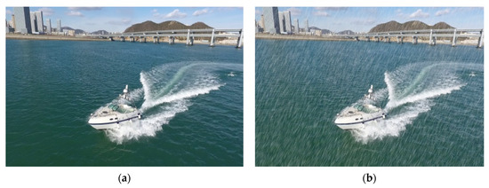 The effect of the deraining model for promoting the performance of ship detection in visual perception system is verified in this section. Because rain streaks can degrade the visibility of ships under complex weather conditions, the incorporation of effective image enhancement would be helpful in several vision models. Therefore, an improved YOLO V5 network was selected to perform ship detection task jointly with our deraining model. Besides, the ship detection dataset used for network training was constructed using a UAV to photograph an independently designed surface unmanned vessel “Lan Xin”, as shown in Figure 8a. In particular, the rainy image was obtained by synthesizing rain streaks, as shown in Figure 8b.