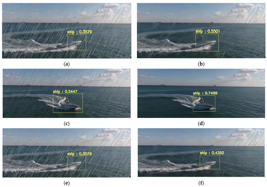 Quantitative results for the improvement of the ship detection accuracy in addition to the deraining performance are reported in Figure 10. Among them, (a) and (c) are the detection results of the rain image, (b) and (d) are the corresponding detection results of the deraining image processed by the designed rain removal network, (e) and (f) are the detection results of rainy images before and after rain removal processing with DTDNet.