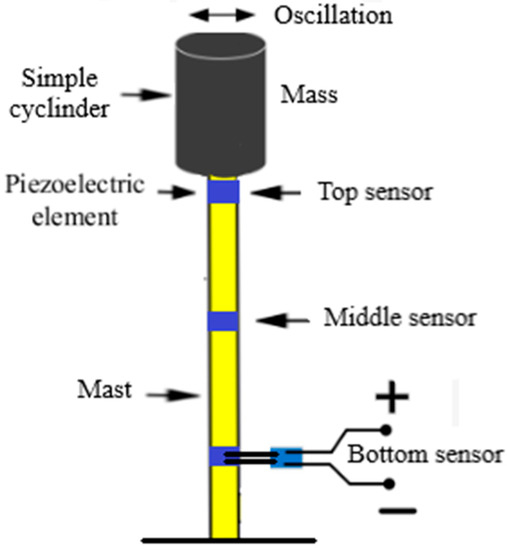 Figure 2 presents the proposed design and the locations of the piezoelectric sensors that convey readings of harnessed energy at three different locations as soon as the elastic rod starts to oscillate due to airflow–structure interactions.