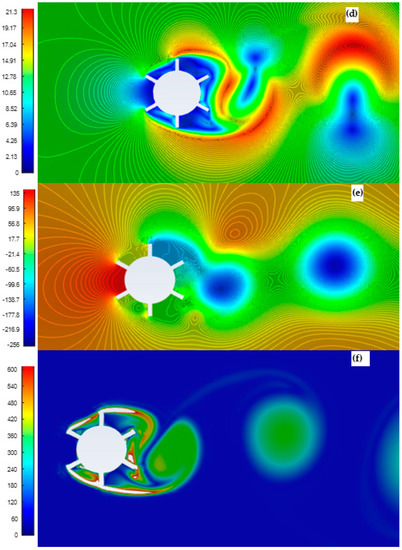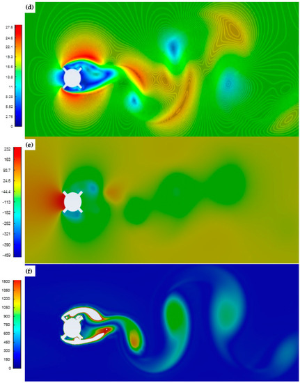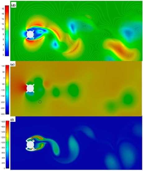 (a) Velocity contours for the simple cylinder at wind speed of 10 m/s, (b) pressure contours for simple cylinder at wind speed of 10 m/s, (c) vorticity contours for a simple cylinder at wind speed of 10 m/s, (d) velocity contours for the modified cylinder at wind speed of 10 m/s for simple cylinder, (e) pressure contours for the modified cylinder at wind speed of 10 m/s, and (f) vorticity contours for the modified cylinder at wind speed of 10 m/s.