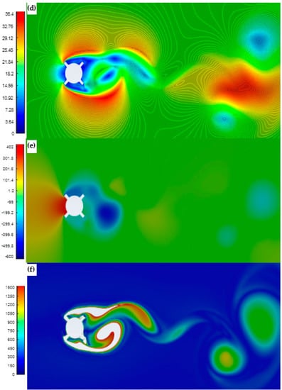 (a) Velocity contours for simple cylinder at wind speed of 15 m/s, (b) pressure contours for simple cylinder at wind speed of 15 m/s, (c) vorticity contours for simple cylinder at wind speed of 15 m/s, (d) velocity contours for modified cylinder at wind speed of 15 m/s for simple cylinder, (e) pressure contours for modified cylinder at wind speed of 20 m/s, and (f) vorticity contours for modified cylinder at wind speed of 15 m/s.
