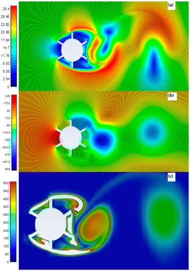 In Figure 4, the wind speed increased to 15 m/s, and CFD simulations were carried out to study the effect of changing the wind speed and the design shape. The simulation results shown in Figure 4 show that when the wind speed is increased, the effect becomes evident that more pressure and more intense vortices are generated. Hence, more oscillations and more power are generated. It becomes even better when the wind speed goes up to 20 m/s, as shown in Figure 5. More pressure contributes to increasing lift forces that are translated as oscillations and more intense vortices, indicating turbulence that causes more vibrations in the design and generates more energy. CDF simulation results showed that the investigated two factors, geometrical design shape and wind speed, play a significant role in creating the oscillations and vibrations that produce more energy. Therefore, it can be concluded that complex cylindrical design shapes and wind speed in the range of 15–20 m/s contribute largely to harvesting more energy.