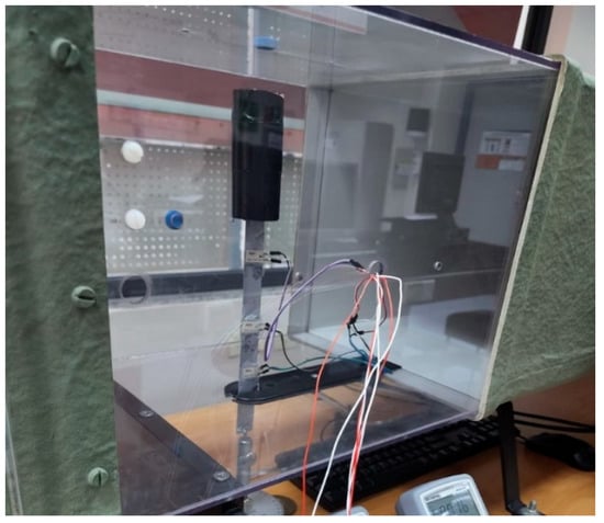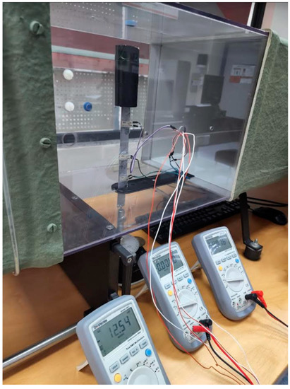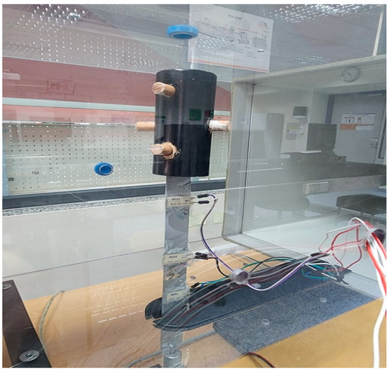 The proposed designs were experimentally tested to determine how much energy can be harnessed from the proposed shape design at low wind speed. A piezoelectric sensor was attached to the proposed design’s mast at three locations: top, middle, and bottom, as shown in Figure 2. The sensors were connected to voltammeters to read extracted voltage, which represents power. The mast angle is the angle of deviation of the mast from the airstream direction. Two angles were tested, at 0 and 5 degrees, to investigate the effect of the mast angle on the lift force and, hence, the harvested power. The prototypes of the suggested designs (simple cylinder and modified cylinder) were placed in an open-loop wind tunnel, as shown in Figure 7, Figure 8 and Figure 9. The proposed prototypes were exposed to an airstream with different flow speeds, starting at 1 m/s up to 25 m/s. However, the focus in this study is the airstream speed in the range of 5 m/s to 20 m/s.