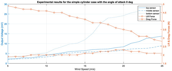 This section presents the results of the prepared experimental setup shown in Figure 8 for the simple cylinder and in Figure 9 for the modified cylinder. The data are related to the three locations of the piezoelectric component, i.e., top, middle, and bottom of that component, and for two different angles of attack, i.e., 0 and 5 degrees, and are presented in Table A1, Table A2, Table A3 and Table A4. As predicted by numerical results, increasing velocity increases the amount of applied force on the vortex generator. Furthermore, adding complexity increases the lift force slightly; however, this change was extensive in the numerical results, which could be related to the non-precise shape of the object added to the primary geometry and the accuracy of the measurement. Similarly, placing the piezoelectric component farther from the vortex generator object induces more electrical voltage in the piezoelectric element. Nevertheless, this phenomenon cannot be observed when the piezoelectric member is in the middle of the mast. The mast becomes an obstacle in the turbulent wind flow, which is neglected in the numerical simulation. This effect probably affects the wind flow around the mast and vortex generator object and enhances the vibrations of this part of the mast. Additionally, considering a constraint for the mast movement and fixing the mast to the ground changes the mast vibration pattern. Finally, it should be noted that the angle of attack almost does not impact the exerted lift force.