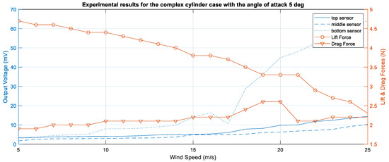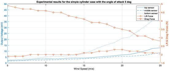 The angle of the mast was adjusted to be 5 degrees, and experimental work was carried out to investigate the effect of the mast angle of attack on the attainable power. Figure A5 reports the experimentally harvested voltage and voltage readings using the piezoelectric sensor located at the top of the mast, at different wind speeds at a mast angle of 5 degrees, meaning the mast deviates by 5 degrees from the flow stream. Figure A6 reports the experimentally harvested voltage using the piezoelectric sensor located at the middle of the mast with a mast angle of 5 degrees. Figure A7 reports the experimentally harvested voltage using the piezoelectric sensor located at the bottom of the mast with a mast angle of 5 degrees. Figure A8 displays the harvested voltage of all simple cylinders using sensors located at the mast’s top, middle, and bottom with a mast angle of 5 degrees.