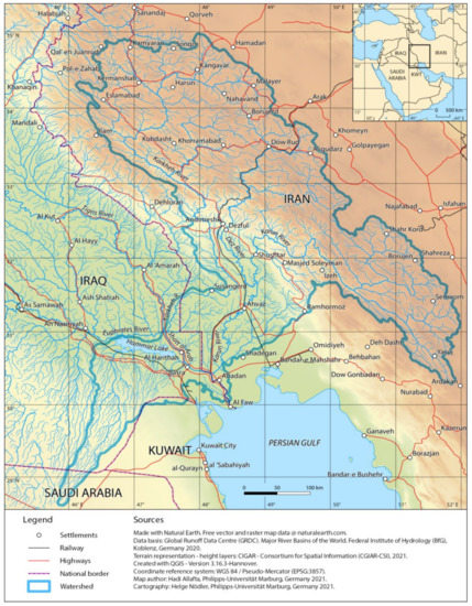 Study site. Note. From “GIS-based Multi-Criteria Analysis for Flood Prone Areas Mapping in the Trans-boundary Shatt Al-Arab Basin, Iraq–Iran” [62].
