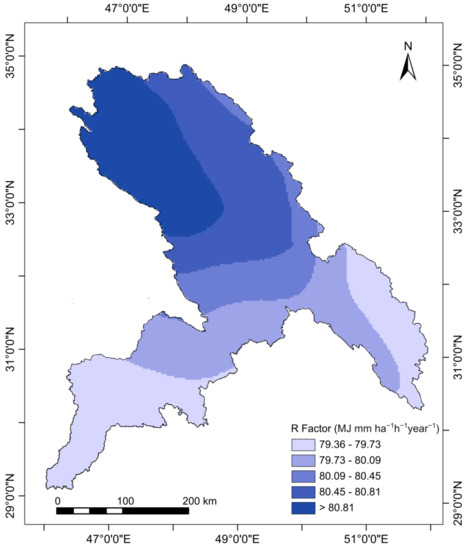 Rainfall erosivity (R) is a function of rainfall’s ability to cause soil erosion by separating and moving soil particles. R calculation necessitates continual and thorough rainfall data [65]. R-factor computation is a complicated process that is highly dependent on the duration, amount, intensity, energy, and size of raindrops, as well as on precipitation pattern and subsequent runoff rates [66]. The rainfall intensity can be used to calculate rainfall erodibility [48,67]. However, determining the R-factor is a challenging task in most parts of the world due to the scarcity of high-resolution rainfall data [68]. Several studies conducted in Iran in sub-catchments within the Shatt Al-Arab basin used monthly and annual precipitation data, e.g., [26,27,69]. However, due to the lack of monthly precipitation data across the entire basin, we used an equation by [70] that required only annual precipitation data. This equation profitably generated compatible R results with the equation applied in the aforementioned studies, i.e., [26,27,69].