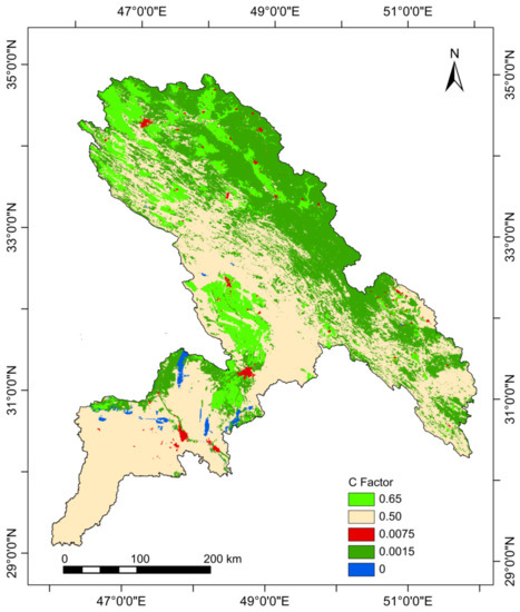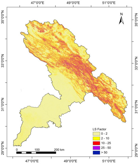 The LS factor was calculated by considering the slope and flow accumulation as inputs, although it depends on slope more than on flow accumulation (Equation (3)). The lowest LS values occupy the low-lying southern lands, reflecting the slope effect on the LS outcomes. In contrast, the highest LS values are situated in the complex northern and eastern landforms of the study area with steep slopes [61] between the anticlines and synclines (Figure 5). The LS factor of the basin has five classes: 0 to 2; 2 to 10; 10 to 25; 25 to 50; and >50, representing 63.2, 21.2, 11.8, 2.9, and 0.9% of the basin’s area, respectively.