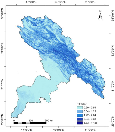 The P factor is controlled by the terrain slope (Equation (4)). The overall slope pattern in the study area demonstrates the steepest slope in the northern and eastern parts and decreases towards the southwest [61]. Therefore, high P factor values are anticipated in the northern and eastern parts, and low values are in the southwestern parts of the basin (Figure 7). A P factor of 0.20 to 0.54; 0.54 to 1.22; 1.22 to 2.04; 2.04 to 3.33; and 3.33 to 17.56 represents 50.9, 26.9, 15.1, 6.1, and 0.9% of the basin’s area, respectively.