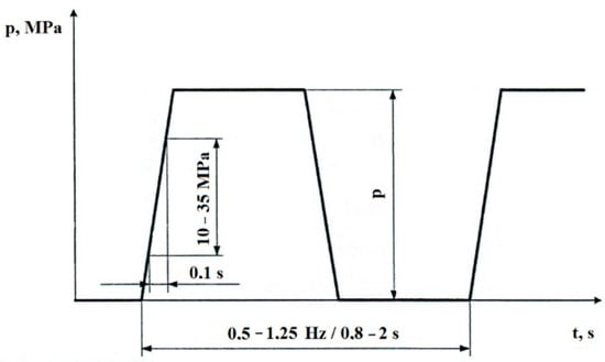 In this case, the accelerated life test of hydrostatic transducers in order to verify the technical life of the transducer under its cyclic loading was according to the prescribed cycle in standard ČSN 11 9287 (ST SEV 2576-80) when determining the requirements for test equipment, we based on the parameters of tested transducers, which set out as follows: “Technical life at cyclic compressive stress from zero to nominal pressure with a frequency of 0.5 to 1.25 Hz, at a pressure flow rate of 10 to 35 MPa·s−1, at nominal parameters must be at least 106 cycles, Figure 1 shows the theoretical course of the loading cycle. A reduction in flow efficiency of a maximum of 20% is permitted. Cyclic compressive stress in the primary hydraulic circuit is provided by an electro-hydraulically controlled switchboard, which is connected to the output of the hydraulic pump. Changing the position of the manifold results in a change in the direction of the fluid flow, thus changing the load pressure conditions at the outlet of the hydraulic pump [,,,,,].