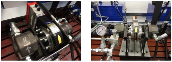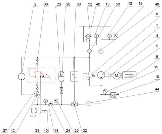 Authors [] used an electro-hydraulic proportional pressure valve in the test case for dynamic loading of the hydraulic pump, by which the hydraulic motor and the hydraulic pump were loaded at the same time, while the hydraulic motor was firmly connected via a coupling connected to the hydraulic pump. The difference between the technical solution of the proposed hydraulic test equipment is that it allows the loading of hydrostatic transducers with operating pressure in the primary and secondary circuit simultaneously, but also separately. It is also possible to use an electro-hydraulic proportional valve to simulate the load only in the primary circuit, in case the circuits are mechanically disconnected after disconnecting the torque sensor.