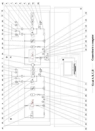 The control and evaluation circuit (C), which is connected to the sensors in the hydraulic circuits (A) and (B), is used to evaluate the measured data as well as to control the laboratory test equipment. Circuit (D) is the whole device when the primary hydraulic circuit (A) is permanently connected to the secondary hydraulic circuit (B) (Figure 5).