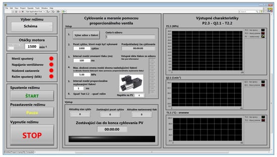 The control system software was created by the employees of the Technical Faculty, SUA in Nitra, Slovakia, in the LabVIEW software (Figure 7). LabVIEW is the integrated development environment for National Instruments visual programming language. LabVIEW is a development environment and uses a graphical programming syntax that makes it simple to visualize, create, and code engineering systems. The control system is built using blocks from the National Instruments company (Austin, TX, USA).