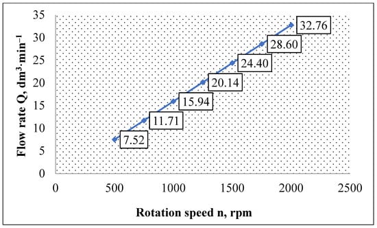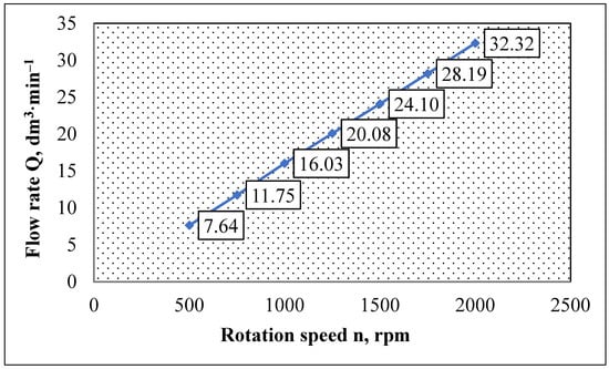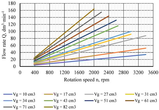 In the verification measurement of the flow characteristics of the hydrostatic transducers, we base ourselves on the data specified by the manufacturer. Figure 8 shows the flow characteristics of the transducers depending on the revolutions specified by the manufacturer. In the primary and secondary circuits of our hydraulic equipment, transducers with a geometric volume of VG = 17 cm3 were used.