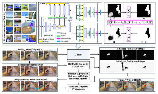 Considering all these issues, this paper proposes a novel approach that effectively models the complementary nature of the foreground/background in primary video object segmentation and efficiently propagates information temporally within a neighborhood reversible flow (NRF). Firstly, the problem of primary object segmentation is formulated into a novel objective function that explicitly considers foreground and background cues as well as their complementary relationships. In order to optimize the function and obtain the foregroundness and backgroundness prediction, a complementary segmentation network (CSNet) with multi-scale feature fusion and foreground/background branching is proposed. Then, to enhance the temporal consistency of initial predictions, NRF is further proposed to establish reliable, non-local inter-frame correspondences. These two techniques constitute the spatial and temporal modules of the proposed framework, as shown in Figure 2.