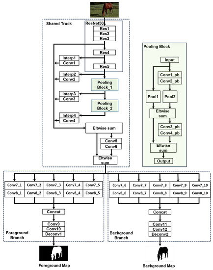 The architecture of the proposed CNN can be found in Figure 3, which starts from a shared trunk and ends up with two separate branches, i.e., a foreground branch and a background branch. The main configurations and details are shown in Table 1. For simplicity, only the foreground branch is illustrated in Table 1, as the background one adopts the same architecture. Note that this network simultaneously handles two complementary tasks as well as their relationships and is denoted as a complementary segmentation network (CSNet). The parameters of the shared trunk are initialized from the ResNet50 networks [64], which are used to extract low- to high-level features that are shared by foreground objects and background distractors. We remove the pooling layer and the fully connected layer after the RELU layer of res5c and introduce two pooling blocks (see Figure 3) to provide features from additional levels and reduce parameters. In order to integrate both the local and global contexts, we sum up different levels of feature outputs by layer Res3, Res4 and Res5 and two pooling blocks by appropriate up/down-sampling operations. After that, a residual block with a 3 × 3 CONV layer and a 1 × 1 CONV layer is used to post-process the integrated features as well as increase their nonlinearity. Finally, the shared trunk takes a image as the input and outputs a feature map with 512 channels.