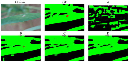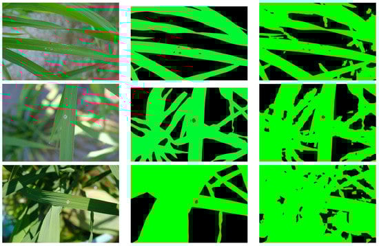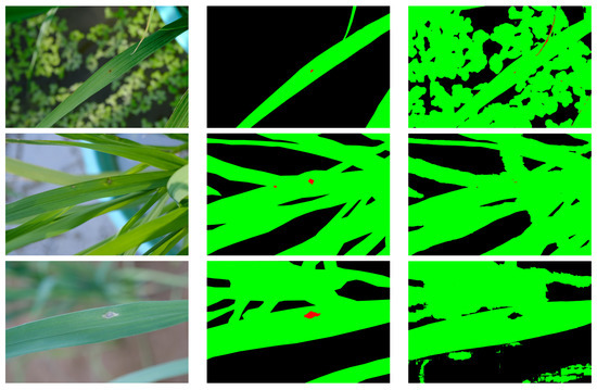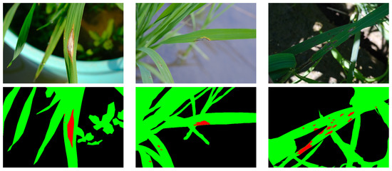 For the second benchmark dataset, we used this benchmark dataset from our earlier work [80]. Figure 4 depicts sample images and corresponding labels after annotation. This dataset comprises three classes: background (BG), rice leaves (RL), and rice blast (RB). The black, green, and red color pixels respectively correspond to BG, RL, and RB classes. This dataset comprises 119 images with a resolution of 6240 × 4160 pixels. Random sampling RoI sizes are 480 × 320 pixels for the semantic segmentation module and 256 × 256 pixels for the GAN modules. Images were split according to a 7:2:3 ratio for training, validation, and test subsets.