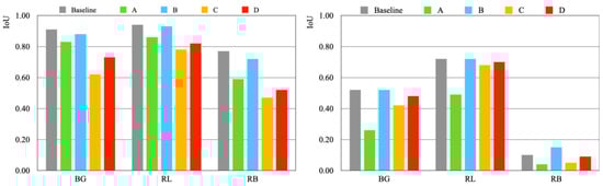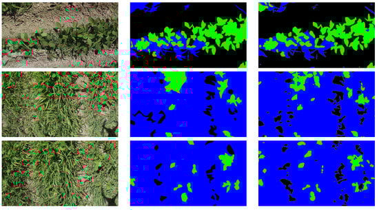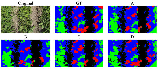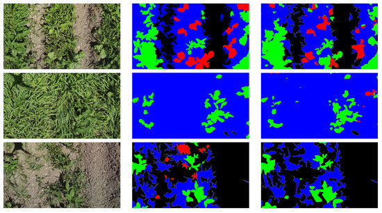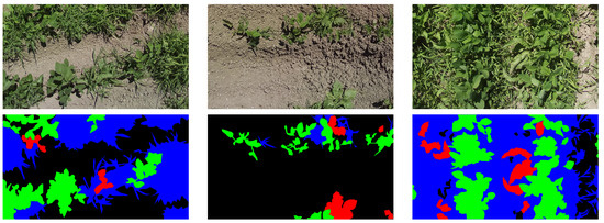 For this study, we created a new benchmark dataset designated as Soybeans. Figure 5 depicts sample images and corresponding labels after annotation. This dataset comprises four classes: BG, soybean leaves (SL), Poaceae weeds (PW), and other weeds (OW). The black, green, red, and blue color pixels respectively correspond to BG, SL, PW, and OW classes. We obtained an HD movie using an onboard camera mounted on a drone (Phantom 4; SZ DJI Technology Co., Ltd., Shenzhen, China). We extracted 300 images with resolution of 1280 × 720 pixels from the movie. The RoI sizes for random sampling were set as 512 × 256 pixels for the semantic segmentation module and 480 × 360 pixels for the GAN modules. The images were split according to a 4:1:1 ratio for training, validation, and test subsets.
