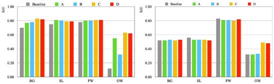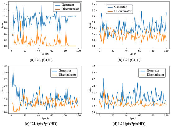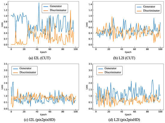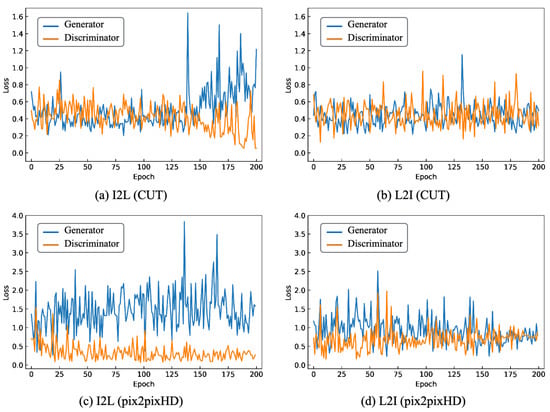 Figure 6 depicts time-series training loss trends for the respective GANs in Cityscapes. For the trends of CUT, the I2L loss from the discriminator was lower than that from the generator after 150 epochs. By contrast, the L2I losses from the generators and the discriminators of both GAN modules are competitive, respectively, at around 0.4 and 0.6.