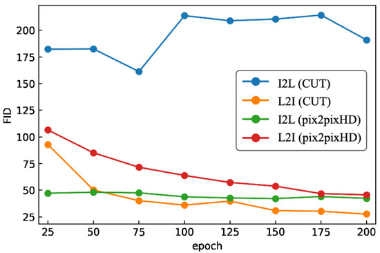 Figure 13 portrays time-series FID trends at 25 epoch intervals in the respective GANs. Overall, the L2I FID scores tended to decrease as the generations progressed. The I2L FID scores for pix2pixHD showed no change through generations. The I2L FID scores for CUT increased after 50 generations.