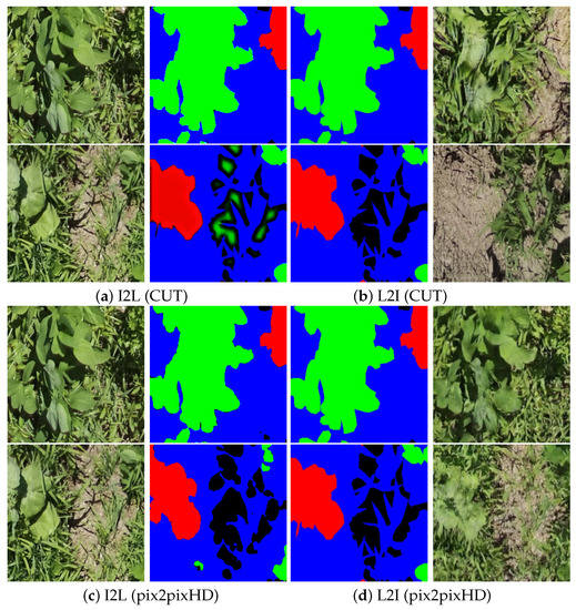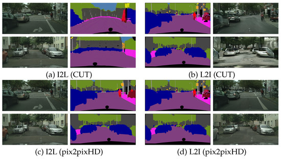 Our proposed method generates labels from images and images from labels using CUT [71] as an unconditional GAN and pix2pixHD [65] as a conditional GAN. This preliminary experiment provides accuracy and characteristics of labels generated from images and images generated from labels. For this study, the processes to be generated from images to labels and labels to images are represented as I2L and L2I.
