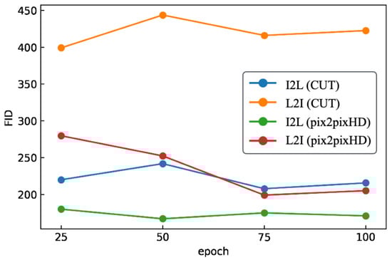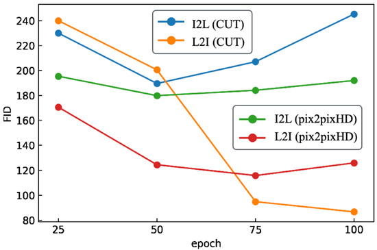 Figure 10 depicts time-series FID trends at 25 epoch intervals in the respective GANs. The L2I FID scores for pix2pixHD dropped smoothly according to the forwarded generations. The FID at 100 epoch is 205.1. By contrast, FID scores of the other three models showed no change according to the increased generations. The I2L FID for pix2pixHD was 170.9 at 100 epoch. This score is low compared to that of other models. The L2I FID for CUT shows two-times higher results than those obtained with other models. This tendency indicates difficulties in ensuring accuracy compared with other models, especially in the L2I process for CUT.