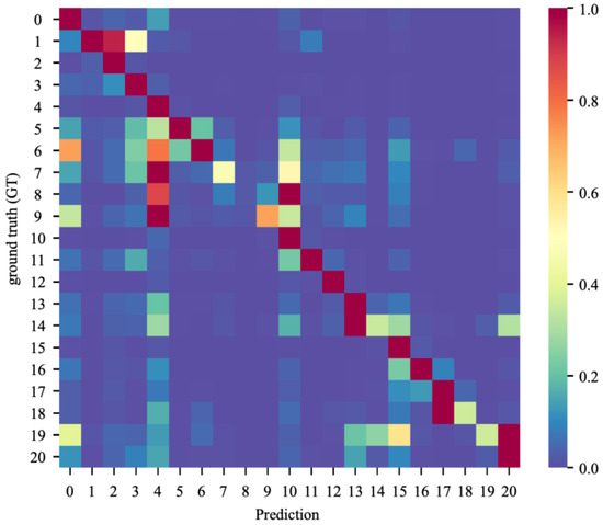 Considering a balance between classification accuracy, implementation platform, and processing efficiency, DeepLabV3+ [103] was used for this study. This network flexibly extracts features with parallel processing of multiple filters that contain arbitrary resolutions by spatial pyramid pooling. The automatic formation of a decoding structure that propagates spatial information held by an encoder provides extraction of clear boundaries between objects. DeepLabV3+ [103] was pre-trained using the COCO-Stuff [113] open benchmark dataset, which provided comprehensive annotations of 172 classes. Based on a comparison of results obtained from our earlier studies [114,115], Xception-65 [116] was used for the network backbone in this study. Here, the semantic segmentation module can be switched flexibly to state-of-the-art or practical backbones according to technological progress, target problems, and specifications, such as ConvNeXt [105], Segmenter [42], SegFormer [41], TransFG [117], MetaFormer [118], and K-Net [119].