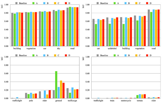 Cityscapes [120] is a benchmark suite for training and validating pixel-wise and instance-level semantic labeling models. Based on this pioneering work, derivative datasets have been proposed such as Citypersons [121], CityWalks [122], and Cityscapes 3D [123]. The Cityscapes suite consists of a large and diverse set of stereo video sequences recorded on the streets of 50 German cities. All images converted from the video sequences were annotated as 20 classes for semantic labels and eight classes for instance labels. For this study, we used images with semantic labels because of the similar specifications in our original datasets.