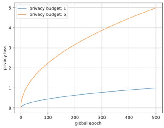 Moments Accountant can provide a tighter bound than the composition theorem on privacy loss. The privacy loss can be calculated by the noise level . The privacy loss with the increasing global epoch is shown in Figure 2. To test the effectiveness of the proposed method under different privacy budgets, we selected and . A larger privacy budget will result in a more accurate model, and a smaller privacy budget will achieve better privacy protection. Then, we let and computed the noise level using Equation (5).