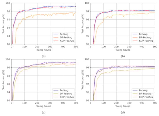 The effectiveness of the method is shown by the model accuracy, and the comparison results are shown in Figure 3. The DP-FedAvg algorithm protected privacy by adding noise to the gradient matrix, and the impact of privacy protection depended on the size of the privacy budget. The smaller the privacy budget, the better the privacy protection. However, as the privacy budget decreased, the noise required to be added increased, which may lead to a decrease in the accuracy of the model. By comparing the accuracy under the non-IID dataset, DP-FedAvg in (a) and (c), a higher requirement for privacy protection needed a smaller , which led to lower accuracy of the model. Furthermore, the accuracy of DP-FedAvg at decreased about 3% compared to that at . Furthermore, the accuracy of DP-FedAvg was lower than and was the same as the pattern in the IID.