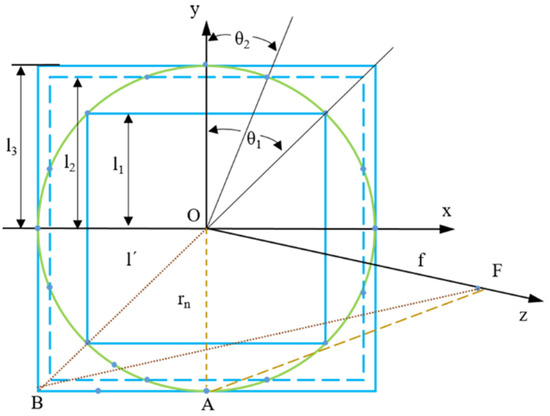 Figure 1 shows the schematic diagrams of S-FZP and circular FZP. represents the edge to center distance, which substantially affects the diffraction performance. The half side length of zone is , and is the radius of circular FZP. Several investigations have focused on the relationship between and , and, proposed different theories on determining the half side length of the S-FZP when it is converted from the circular FZP. in the first one, González et al. [7] indicated that the area of S-FZP should be the same as circular FZP, as . Thus, . The second, Alda, J indicated that optimized diffraction performance of polygonal FZP depends on the number of sides s [21], and the determination of is related to s, as . When the polygon is square, then , and . The third, Minin et al. [8] proposed that different half side lengths can be obtained via the angle of the and (shown in Figure 1). When , when , ; and when , . The diffraction performance primarily determines the transfer from circular FZPs to S-FZPs.